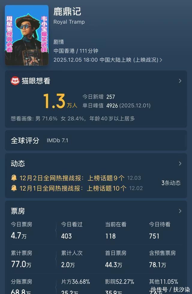 上映3天累计票房仅77万,单日票房更是从首日的40万一路下滑,到第三天只剩十几万元,排片占比也被压缩至1.1%,二线以下城市几乎看不到排片痕迹。